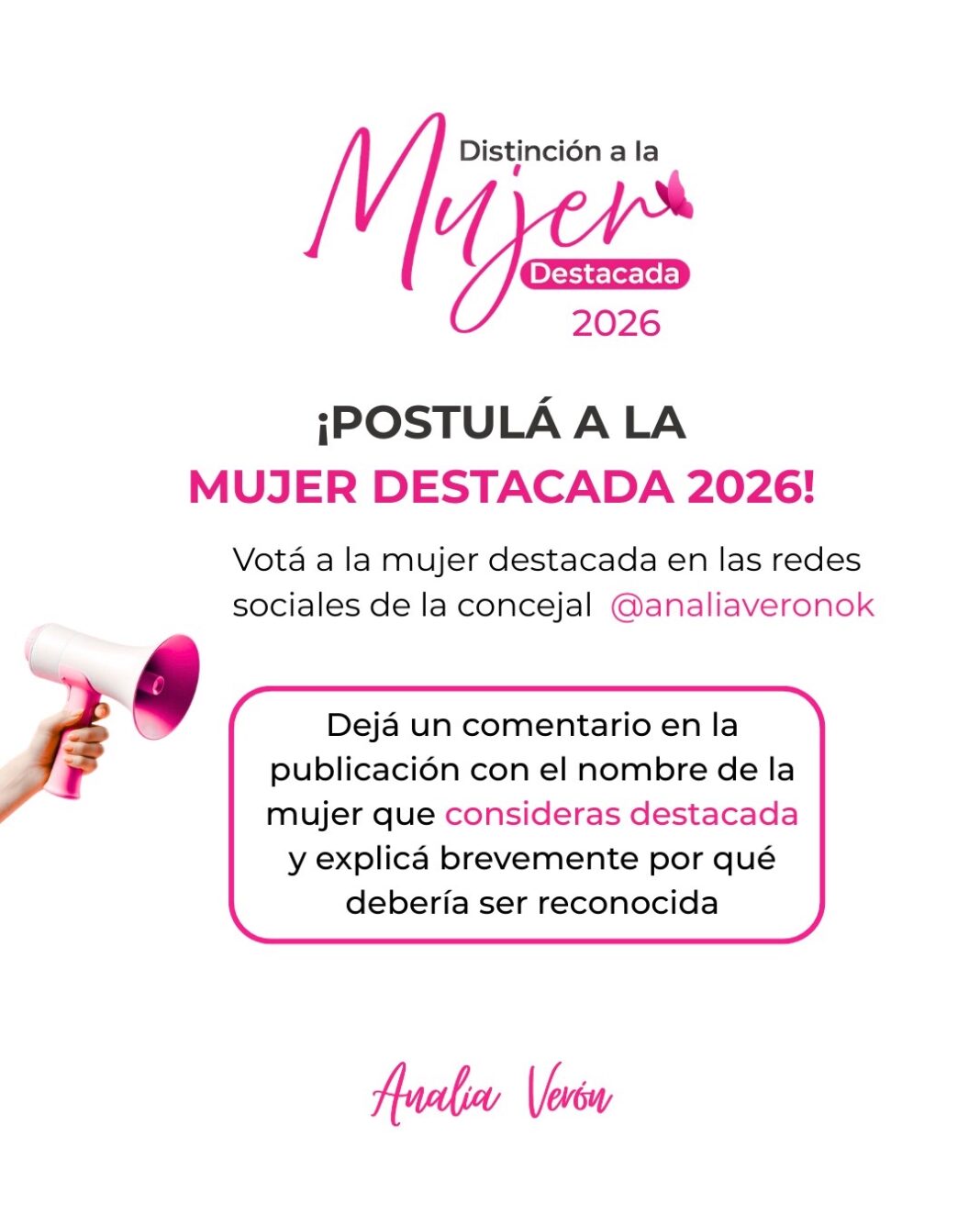 Para participar, los interesados deberán ingresar al perfil oficial de Instagram de la concejal (@concejalanaliaveron) y comentar en la publicación correspondiente ( https://acortar.link/uIgZCZ ) el nombre de la mujer postulada junto a una breve descripción de su trayectoria, labor social o aporte comunitario.
